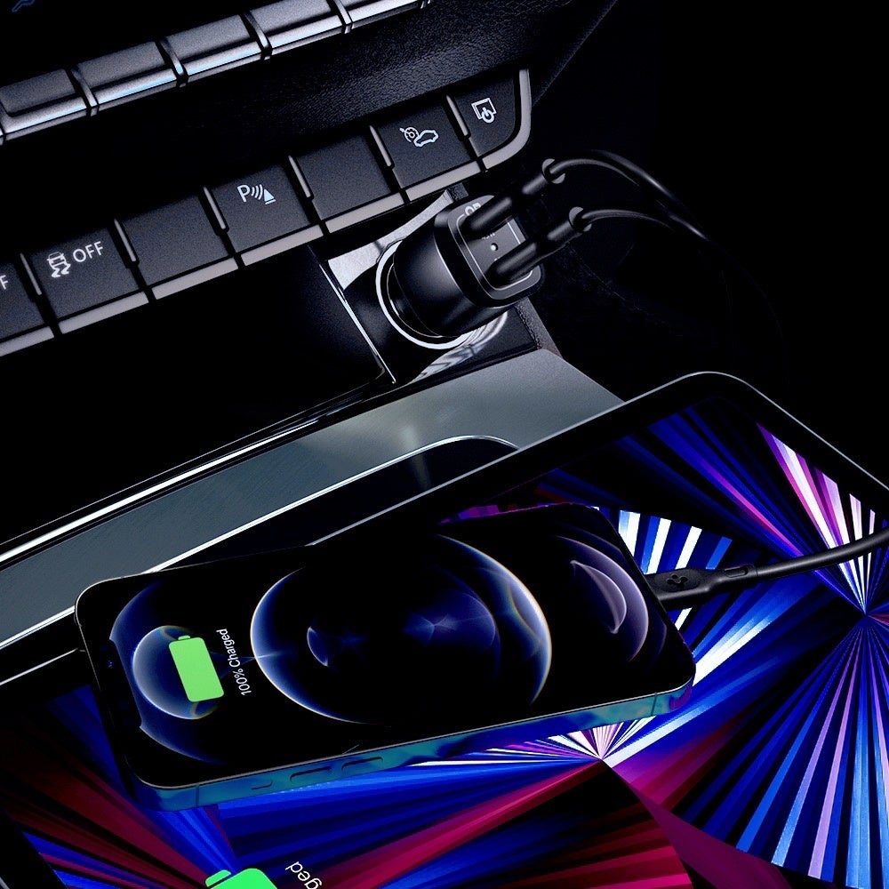 Power Delivery対応の最大45W出力USB-CポートとPD対応最大20W出力USB-Cポートを搭載、車の移動中にiPhoneやBluetoothイヤホン、タブレット端末、USB-C搭載のMacBookやノートパソコンまで充電可能な高性能・高出力カーチャージャー。