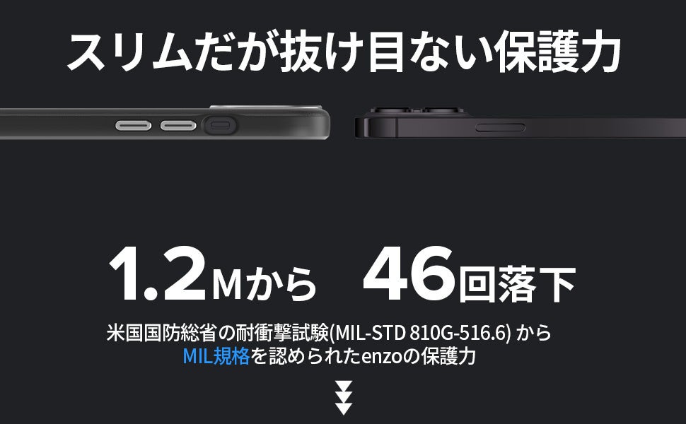 こんなspigenのこだわりが集まれた構造のおかげで、エンツォは米国国防総省の耐衝撃試験(MIL-STD 810G-516.6) からMIL規格を認められた保護力にもかかわらず、たった2.3mmの厚さという驚異をもたらす数値を見せています。