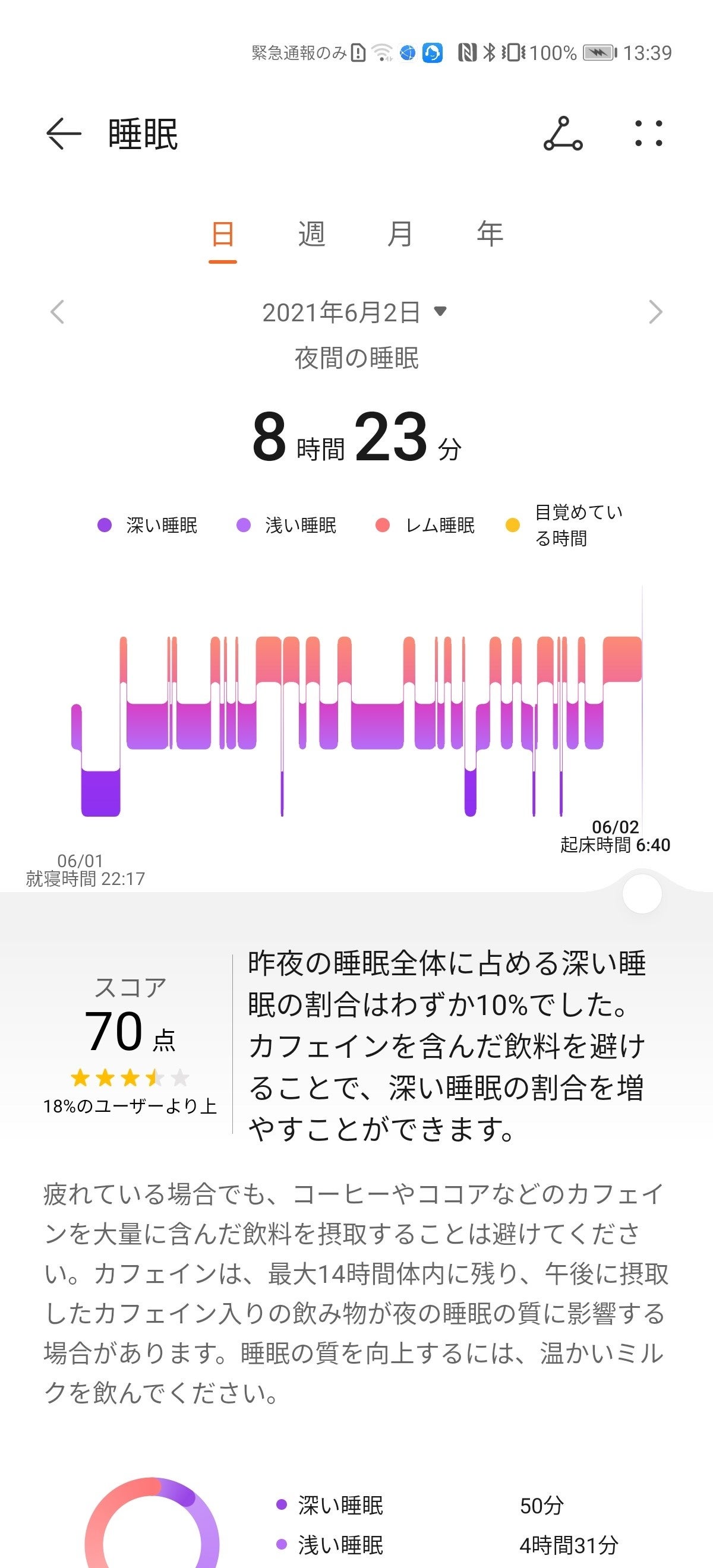 睡眠時間はもちろん、深い睡眠・浅い睡眠・レム睡眠の割合や、深い睡眠の連続性など、睡眠の質を解析します。計測された睡眠データに基づき、より良い睡眠のためのアドバイスを提案し、ユーザーの睡眠を改善するためのサポートも行います。