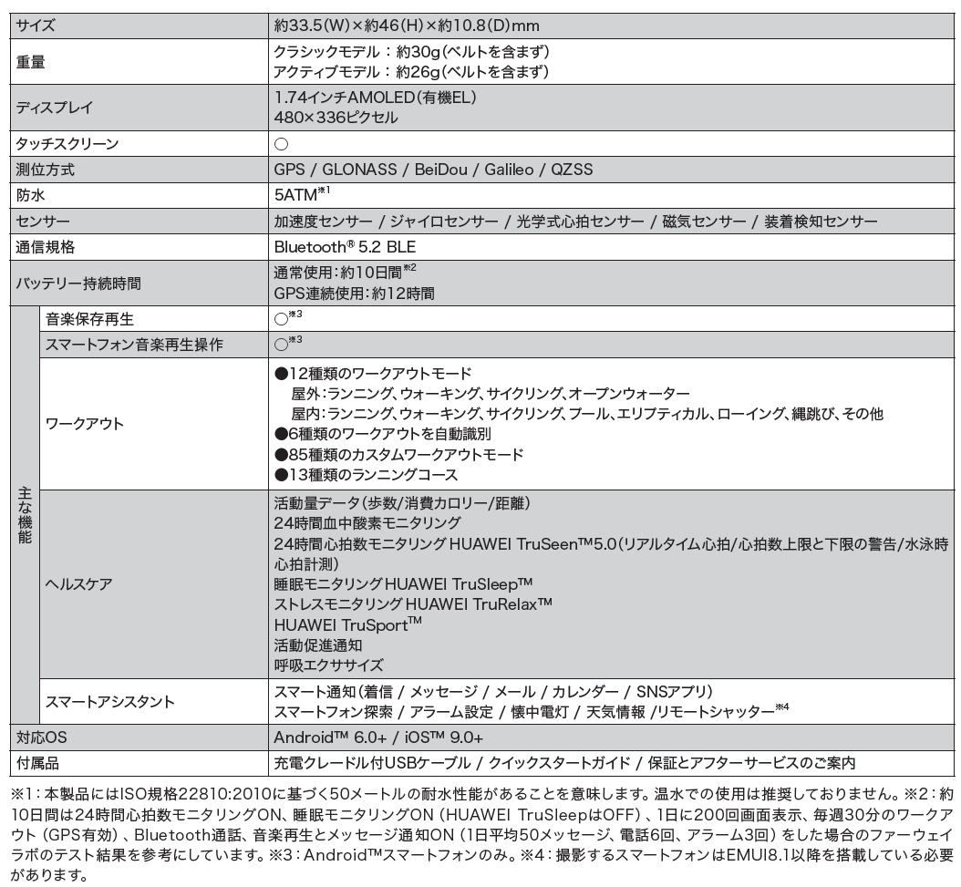 ●画像はすべてイメージです。実物と若干異なる場合があります。 ●掲載製品の仕様・性能は予告なしに変更する場合がありますので予め了承ください。 ●本製品は日常的な運動・健康管理のための製品であり、医療機器ではありません。本製品のデータは医療行為または精度を要する業務・専門的な計測には使用いただけません。 ●HUAWEI、HUAWEIロゴはHUAWEI TECHNOLOGIES CO., LTDの商標または登録商標です。 ●Android™は、Google LLCの商標または登録商標です。●Bluetooth®は、米国Bluetooth SIG, Inc. の登録商標です。 ●IOSはCiscoの米国およびその他の国における商標、または登録商標であり、ライセンスに基づき使用されています。 ●その他会社名、各製品名は、各社の商標または登録商標です。