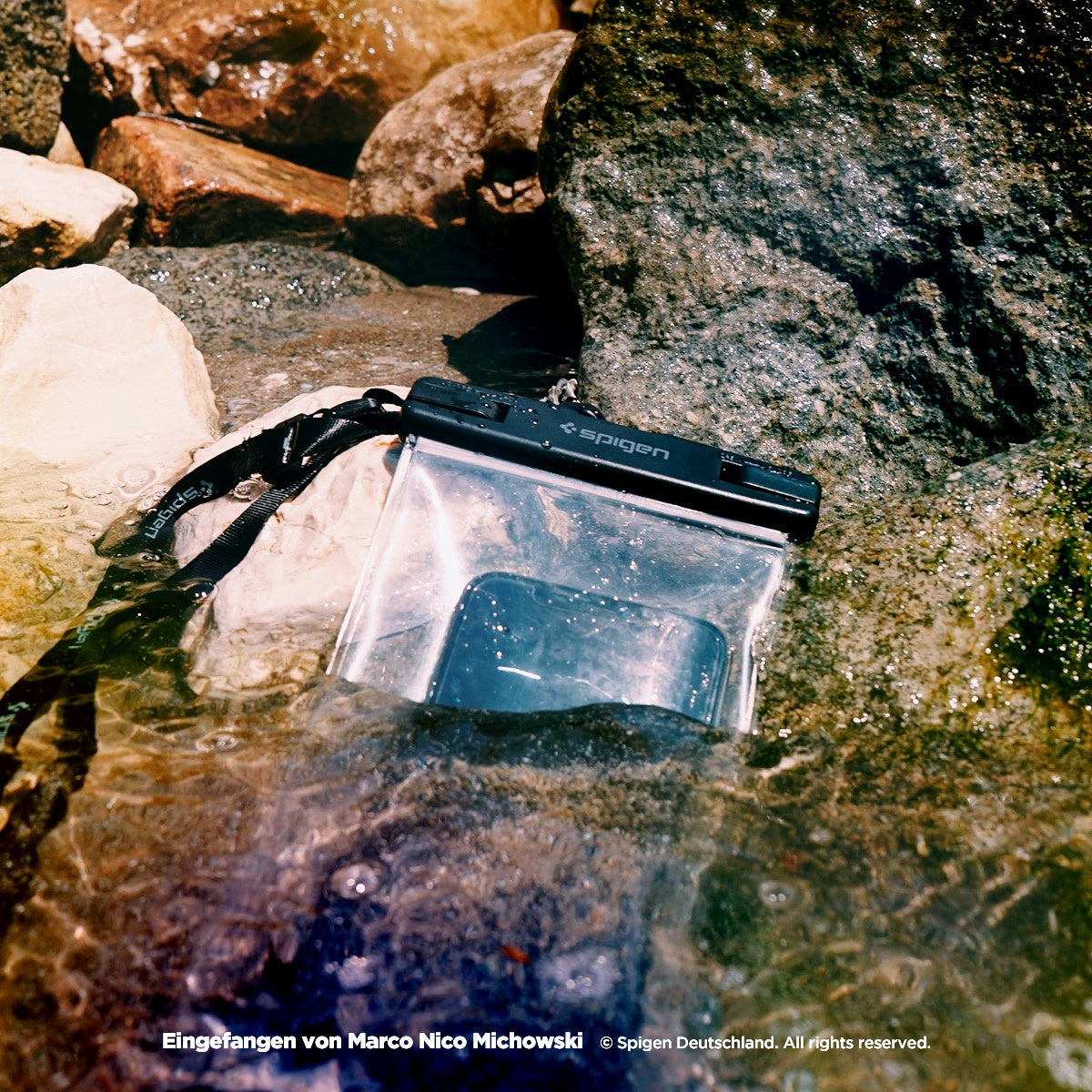 最大6.9インチまで全機種対応される最高防水等級IPX8取得されているSpigenのスマホ 防水ケース。