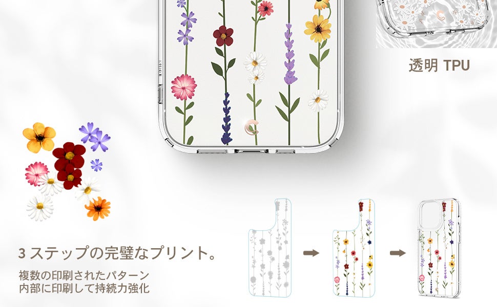 Classyな花柄の透明クリアケースです。スマホ本来の色を見せながら春の香りを感じたい方におすすめです。 CYRILLならではのデザイン保護技術により、柄のディテールをさらに長く楽しめます。