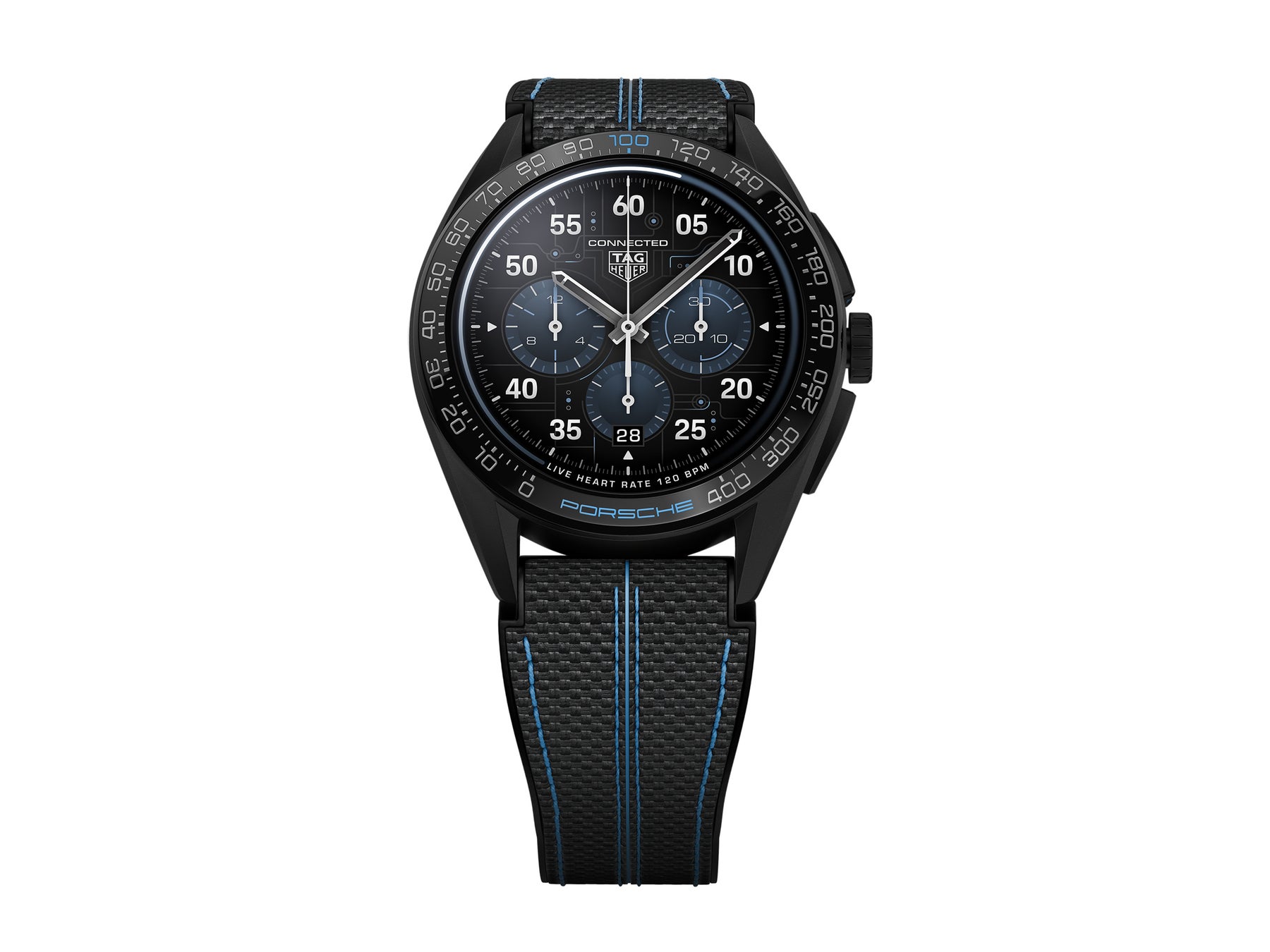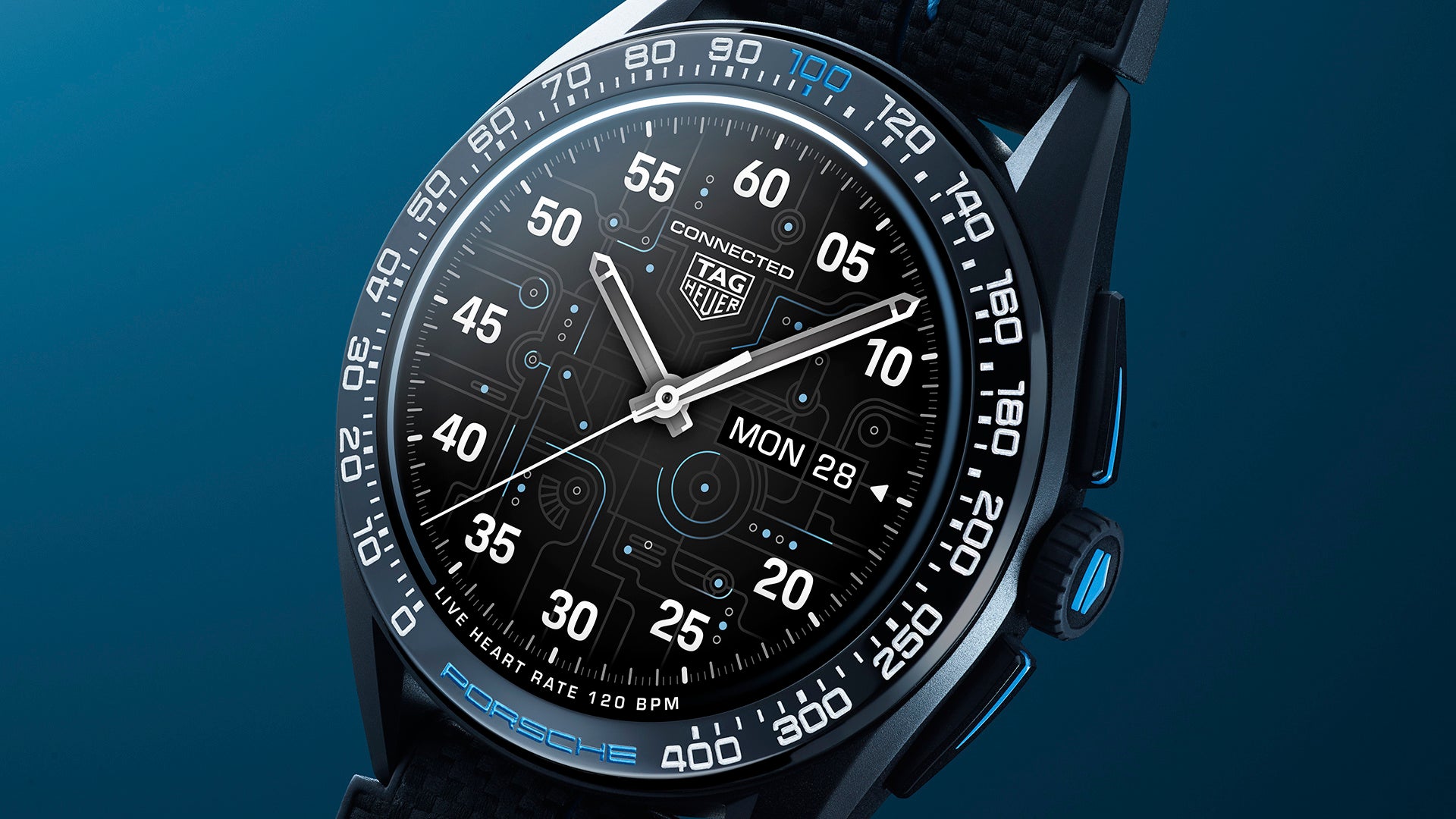 新しい「サーキット」ウォッチフェイスはフローズンブルーカラーがアクセントとなっており、電気回路(電気自動車タイカンとタグ・ホイヤー コネクテッドウォッチ自体の両方を意識したもの)とレーシングサーキットを示唆するデザインです。