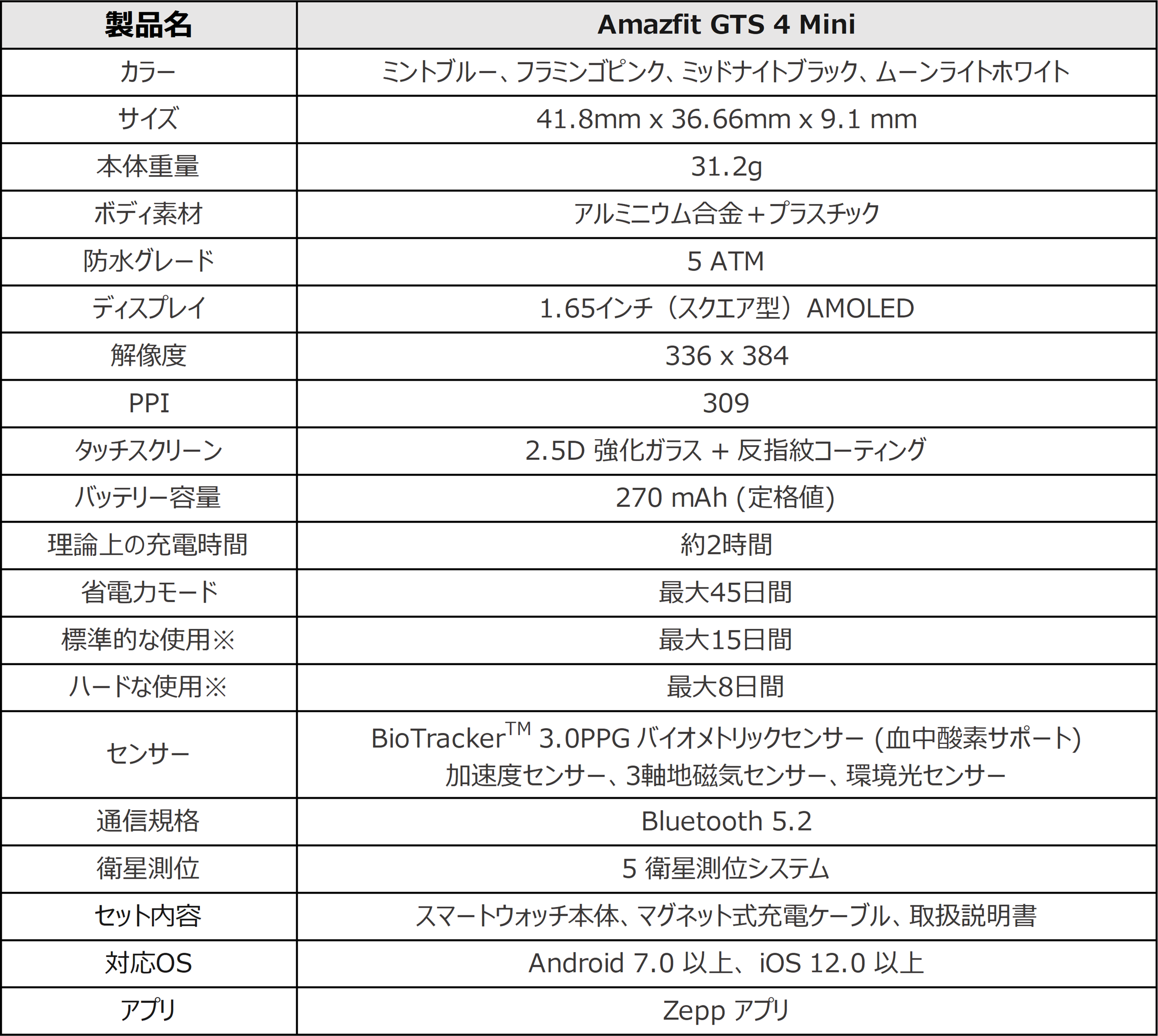 - 製品名:Amazfit GTS 4 Mini(日本語読み:アマズフィット ジーティーエス フォー ミニ)