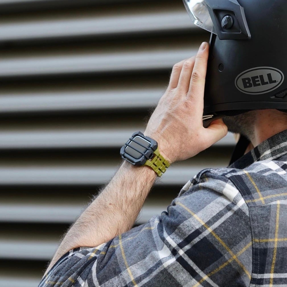 また、ストラップからケースまで一体のデザインにすることで、アップルウォッチとは思えない無骨な外観に仕上がっています。今までに類を見ない、アップルウォッチのアクセサリー製品で今一番注目のプロダクトです。