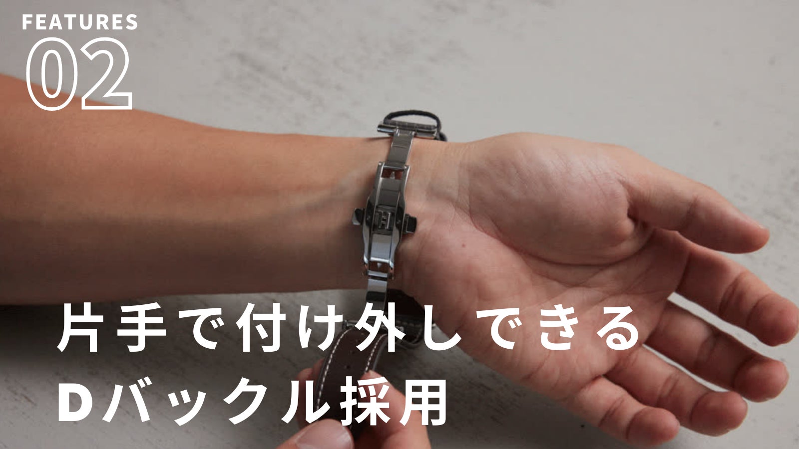 高級時計で主に使用される、Dバックルを採用。これにより、片手で簡単にApple Watchの装着が可能です。
