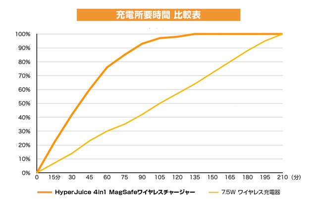 MagSafeテクノロジーで、最大15Wの電力でiPhoneを安全かつ高速にワイヤレス充電可能。1時間で0%から75-80%まで充電でき、従来の7.5W充電より100分以上早く同充電容量まで到達します。