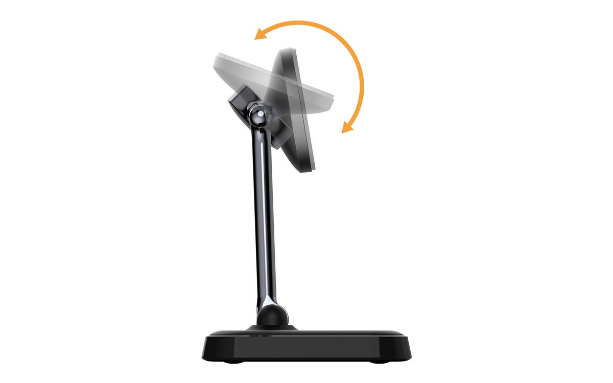 ヘッド部分は縦方向に回転可能。デスクでもベッドサイドでも、iPhoneを見やすい角度に調整できます。