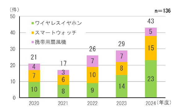 年度別事故情報登録件数(ワイヤレスイヤホン、スマートウォッチ、携帯用扇風機の合計) 出典:消費者庁