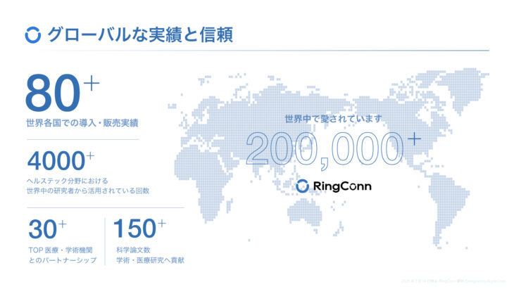 RingConnは、2021年に香港で設立。Kickstarterでは6.6億円以上を調達し、Makuakeでも1.42億円/3,678人の支援を達成。現在は世界80ヵ国以上で販売され、医療・学術機関との共同研究も進めています。
