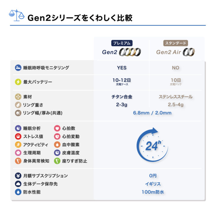 本モデルは、「手軽に始められる本格派スマートリング」として、これまでのプレミアムモデル『Gen2』と同様の高精度センサーを備えながらも、より軽量でスリムなデザインを実現しています。