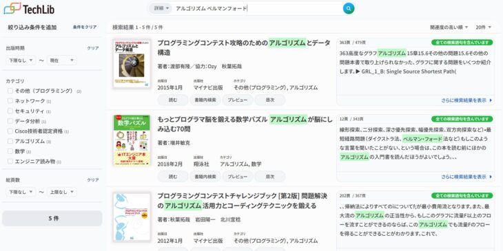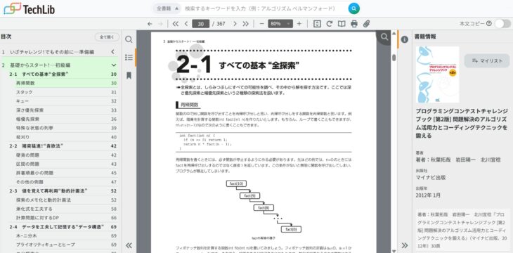TechLibでは、キーワード検索により、タイトルだけでなく書籍本文まで含めた全文検索が可能です。必要な技術や用語から関連書籍を探しやすく、効率的な学習を行える点が特徴です。