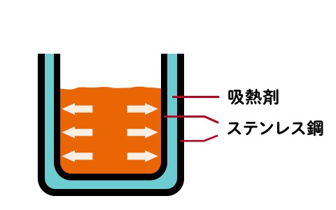 本製品は、本体の内側と外側にステンレスを使用し、その間に吸熱剤を入れた独自構造を採用しています。