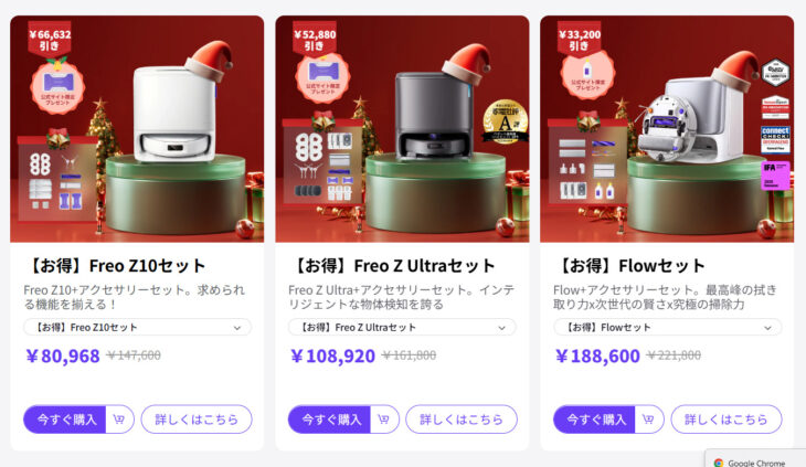 対象はロボット掃除機本体からアクセサリーセットまで幅広く、