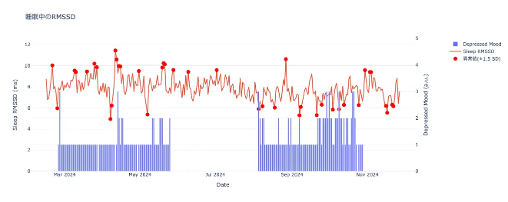 夜間のHRV指標であるRMSSDが、個人のベースラインから1.5標準偏差以上低下した場合、約87%の確率で7日以内に抑うつスコアが悪化していました。