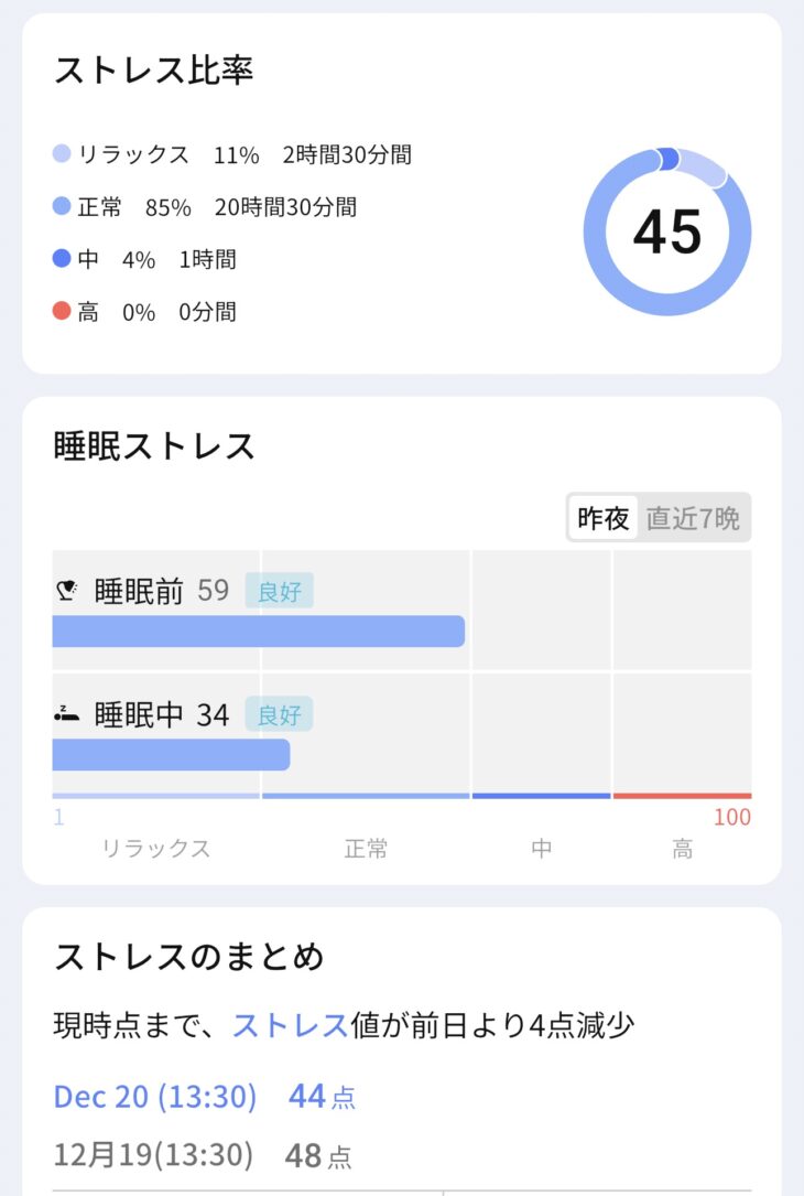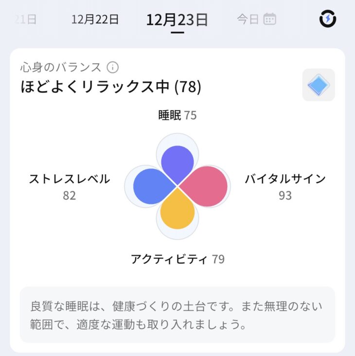 現状、ユーザー目線では「この数値をどう行動に落とし込むか」の提案がもう少し欲しいと感じる場面もありますが、少なくとも毎日の状態を可視化してくれる基盤はかなり強いと感じました。