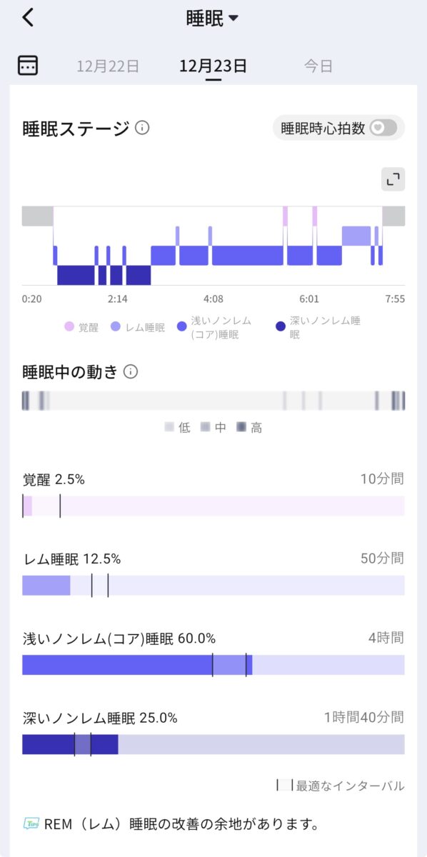 睡眠計測では、睡眠スコアに加えて、睡眠ステージ(深い眠り、浅い眠り、REM、覚醒)の詳細な分析が行われます。