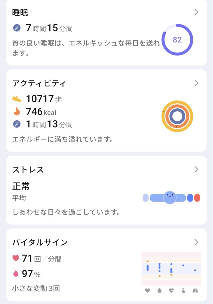 睡眠・ストレス・運動の計測はいずれも安定しており、日常使いのデバイスとして不安を感じる場面はありませんでした。