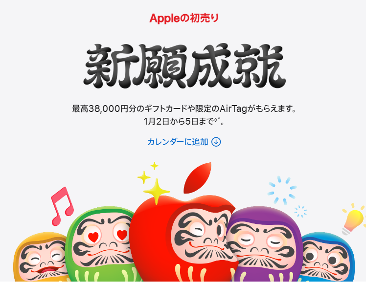 2026年のApple初売りでは、「新しい願いが成就する」という意味を込めた造語「新願成就」がテーマとして掲げられています。筆文字で描かれた「新願成就」の文字に、ダルマの顔が描かれた赤いAppleロゴ、オレンジ・緑・紫・青のダルマが並ぶビジュアルは、年始らしい縁起の良さを感じさせるデザインです。