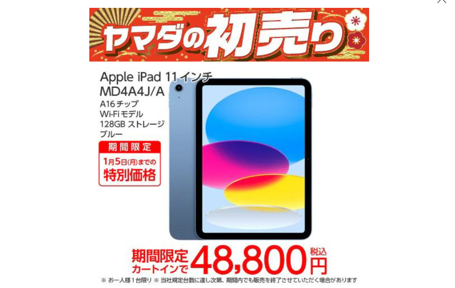 ヤマダ電機の公式通販サイト「ヤマダウェブコム」にて、2026年の初売りセールとしてiPadの大幅値引きが実施されています。