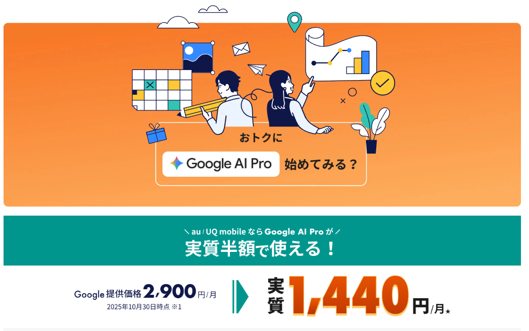 メタディスクリプション:au/UQ mobile経由ならGoogle AI Proが実質1,440円。Gemini Proの機能やできること、注意点を初心者向けにわかりやすく解説。