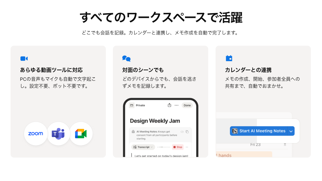 それでもNotion AIのAIミーティングノートが強いのは、議事録が“仕事の置き場”に直結する点です。