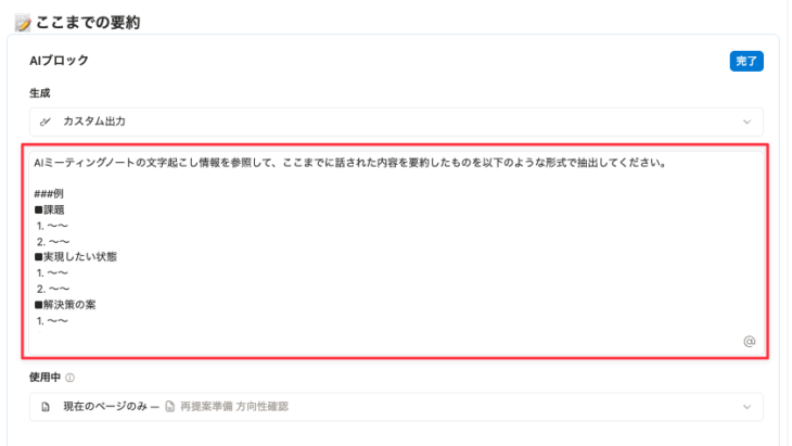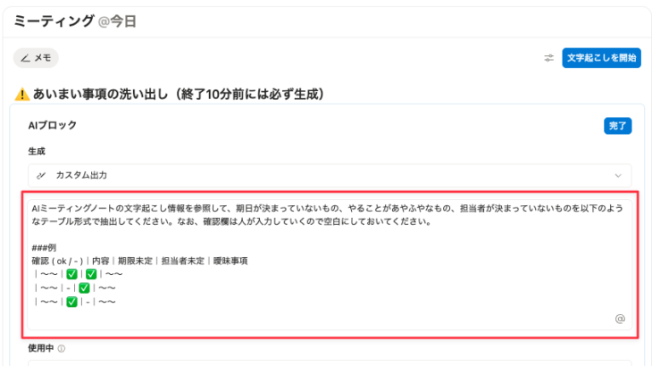 AIミーティングノートのメモ欄に、要約の指示を埋め込んだAIブロックを用意しておきます。