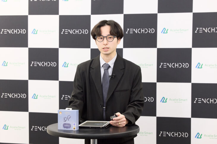 当日は、株式会社Acalie スマートプロダクト事業部 セールスマネージャーの木村龍成(きむら りゅうせい)氏による製品プレゼンテーションが行われ、その後の質疑応答には、木村氏に加え、Zenchord AI 創業者兼CEOのOliver(オリバー)氏もオンラインで参加しました。