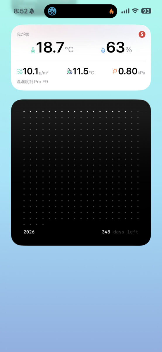 one yearのウィジェットをiPhoneのホーム画面やロック画面に追加すると、ドットで構成されたシンプルなビジュアルとともに、「今年があと何日残っているか」が表示されます。