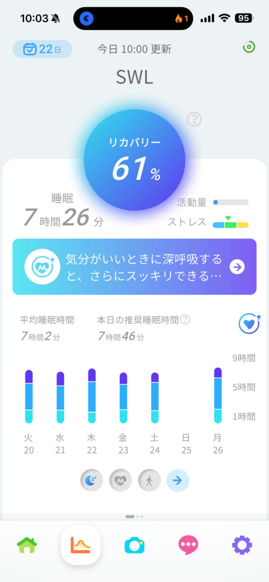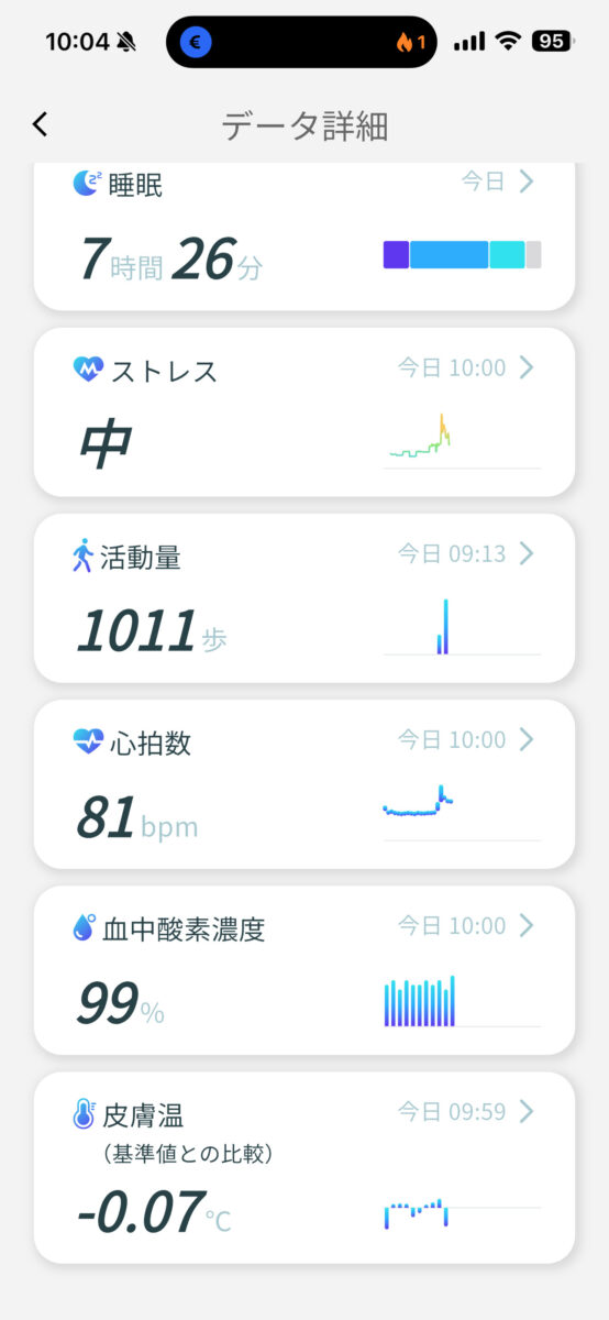 なお、睡眠データはそのままリカバリースコアの算出にも反映されるため、「しっかり眠れたつもりだったのに回復度が低い」「睡眠時間は短めでも意外と回復できている」といった気づきにつながるのも、このリングならではの面白さです。