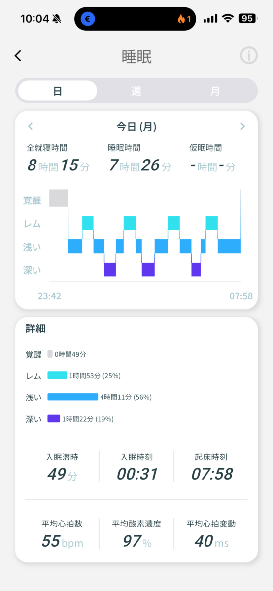 計測されるのは、睡眠時間だけでなく、レム・浅い・深い睡眠の内訳や入眠までにかかった時間、就寝中の心拍数など。アプリ上ではグラフで確認できるため、「この日は途中で目が覚めていた」「深い睡眠が短かった」といったことを後から振り返れます。