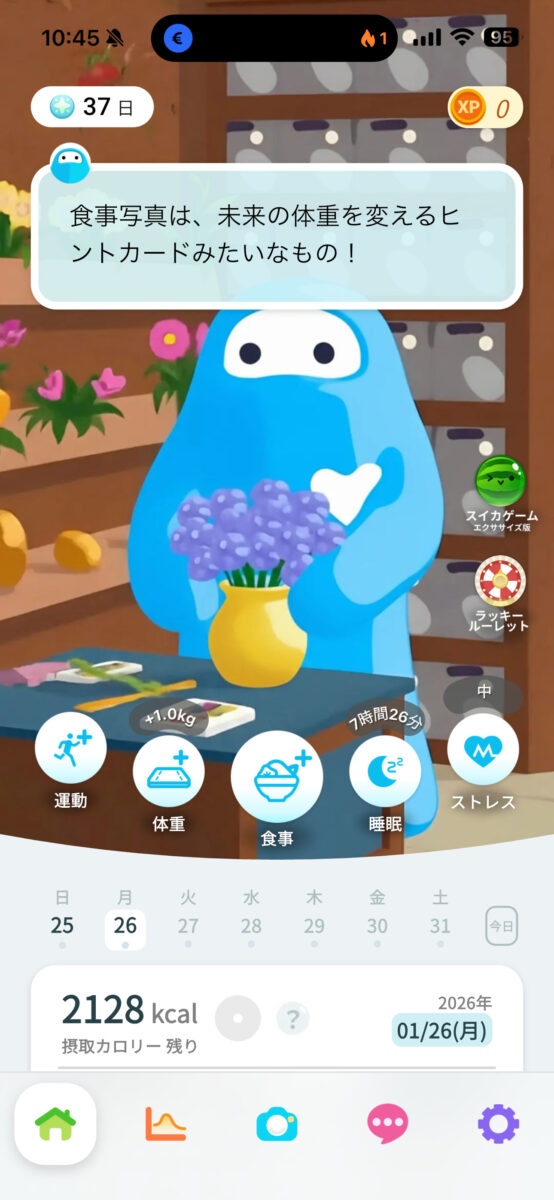 実際に触ってみると、データをただ羅列した“健康管理アプリ”というより、キャラクターを前面に出したポップな仕上がりになっていました。