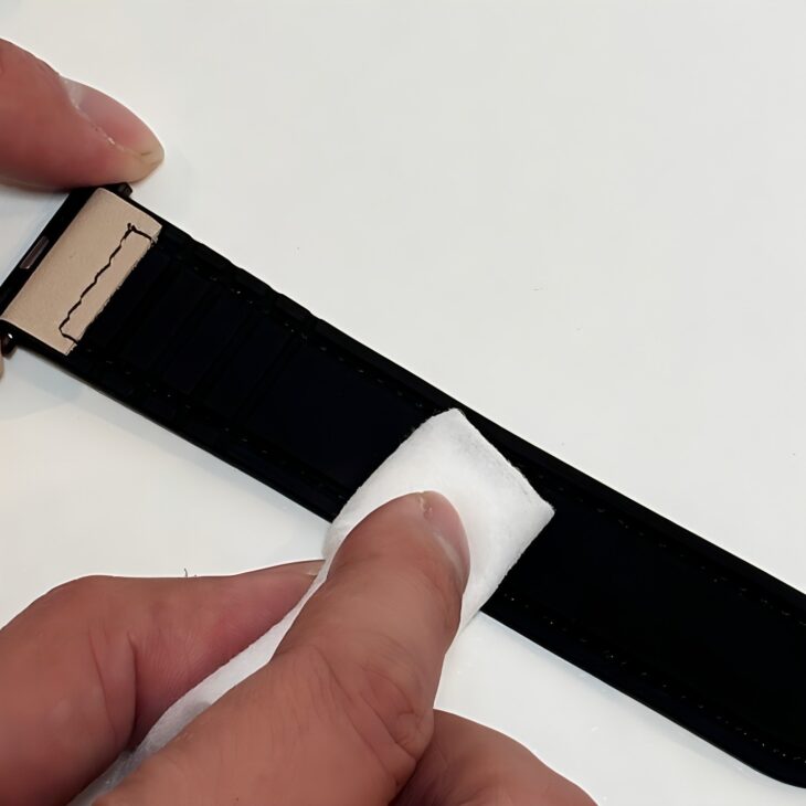 肌に触れる部分はシリコン素材のため、汗や水を気にせず使用できます。日々のお手入れも拭くだけで済み、レザーバンド特有のメンテナンス負担を大きく軽減しています。