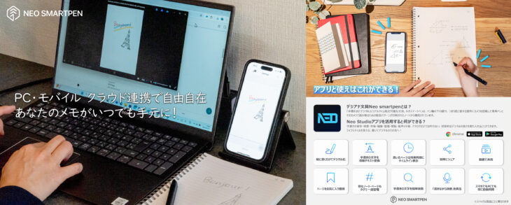 Neo smartpenを支える専用アプリは「Neo Studio 2」。モバイルアプリだけでなく、Webブラウザ版(https://neostudio2.io)にも対応しており、デバイスを問わずアクセスできます。