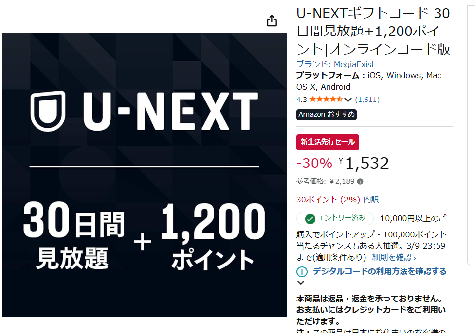 Amazonでは、U-NEXTの30日間見放題+1,200ポイント付きギフトコードが販売されています。