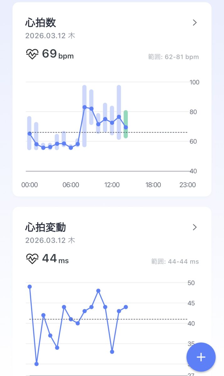 HRVは自律神経の状態や身体の回復状態を示す重要な指標で、トレーニングやコンディション管理の参考にもなるデータです。こうした指標をしっかり記録してくれる点は、スマートリングとして評価できるポイントです。