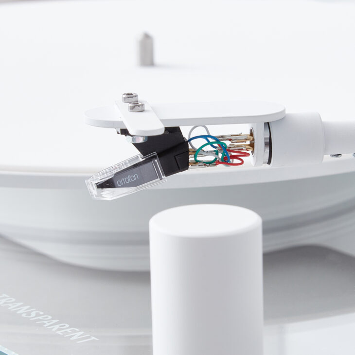 本体はアルミニウムと強化ガラスで構成されており、TRANSPARENTのスピーカーシリーズと同じ素材・デザイン哲学を継承しています。特注のアルミニウム製トーンアームには、独自に開発したヘッドシェルが搭載されており、標準的な取り付け穴を持つ可動マグネット・カートリッジであれば幅広く対応できます。