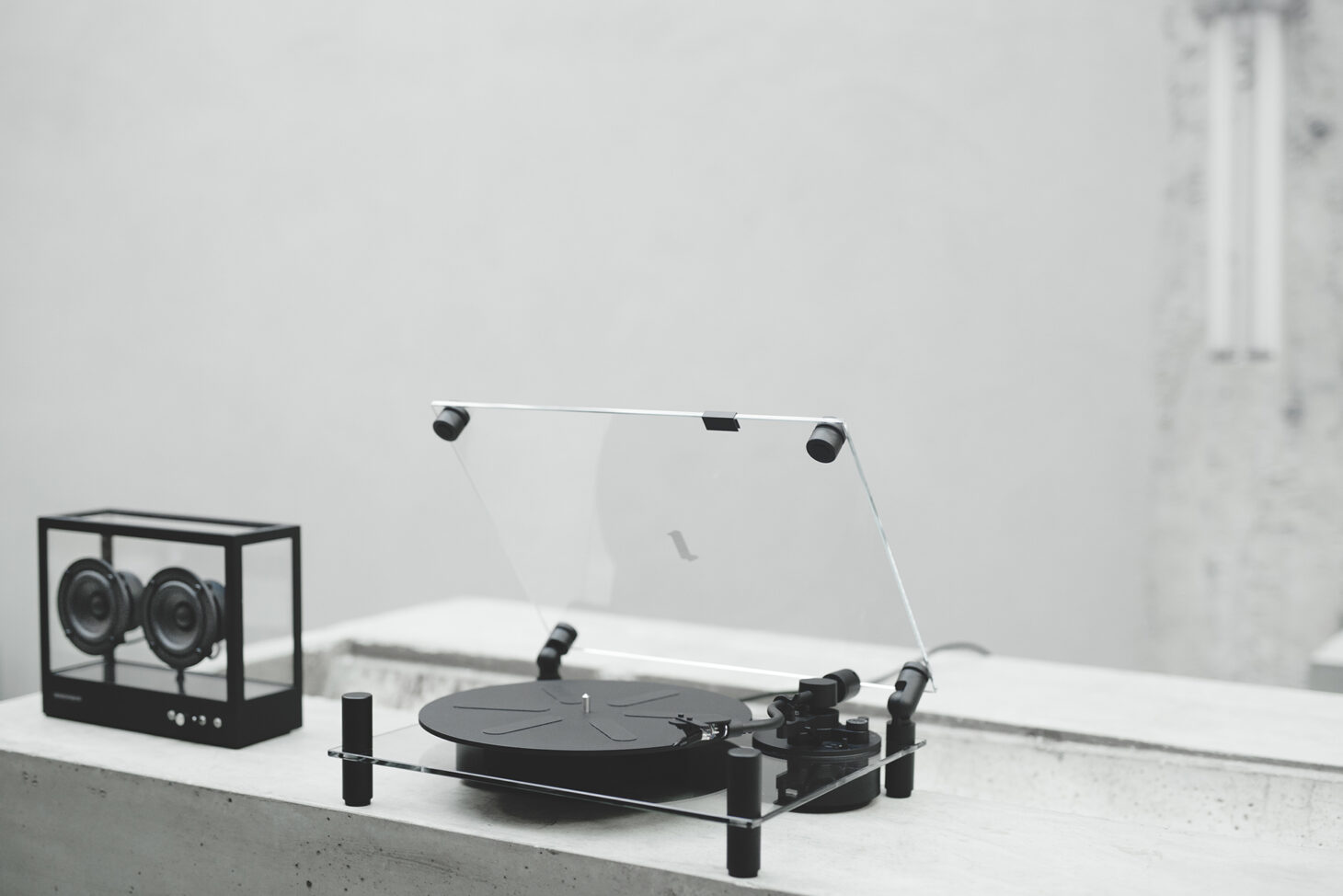 TRANSPARENTというブランド名が示すとおり、製品の随所に「見せる設計」が貫かれています。スピーカーに始まり、今回紹介するターンテーブルに至るまで、アルミニウムと強化ガラスを組み合わせた構造を採用。内部の機構が透けて見えるデザインは、機能を隠すのではなく、機能そのものを美しく見せるという思想から生まれています。