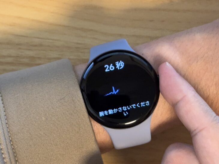 筆者も実際にPixel Watchで心電図を測定してみました。測定自体は拍子抜けするほど簡単で、アプリを立ち上げてリューズに指を当てるだけ。30秒間じっとしていれば、あっという間に結果が出ます。
