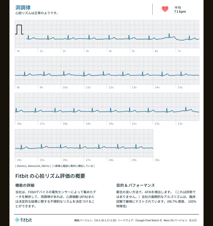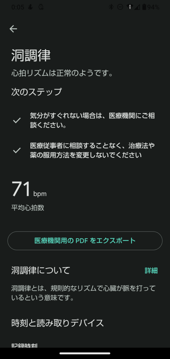 結果は「洞調律」で、心拍リズムに異常は見られませんでした。Fitbitアプリでは測定日時とあわせて結果が記録され、過去の履歴も一覧で確認できます。結果をタップすると詳細が表示され、「医療機関用のPDFをエクスポート」することもできるため、健康診断やかかりつけ医への相談時にデータを持参するのにも便利です。
