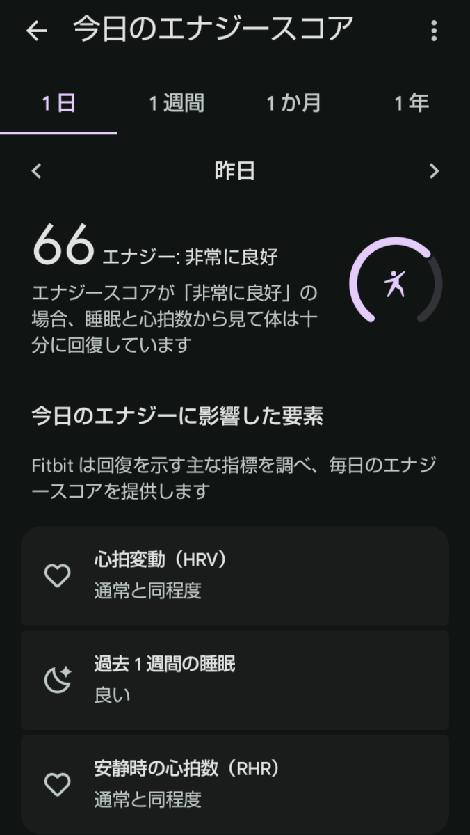 つまり、エナジースコアは自分の体感とかなり近い数字が出る印象です。「なんとなく体調がいい」「今日はちょっとだるい」という曖昧な感覚を、客観的な数値として見せてくれるのは、日々の体調管理において心強いポイントだと感じました。