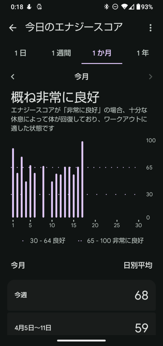 週ごとの日別平均を比較すると、4月5日〜11日の週は平均59だったのが、翌週には平均68まで改善しています。日々の睡眠や体の回復具合がスコアに反映されていることが、数字の推移からも見て取れます。