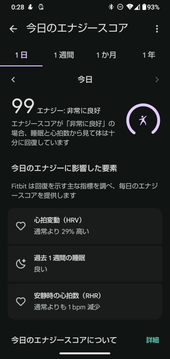 こちらはある日のエナジースコア画面です。この日のスコアは99で、「非常に良好」と表示されました。内訳を見ると、心拍変動(HRV)が通常より29%高く、過去1週間の睡眠は「良い」、安静時の心拍数(RHR)は通常よりも1bpm低いという結果です。3つの指標がすべて好調だったため、ほぼ満点に近いスコアが出ています。