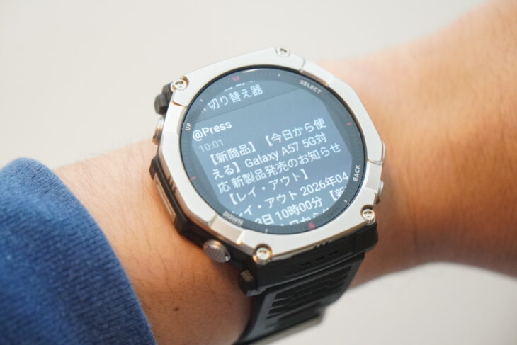 スマホからのアプリ通知に対応。筆者はiPhoneとペアリングして使いましたが、Androidスマートフォンの場合はSMSやLINEへの返信もウォッチ上から可能です。