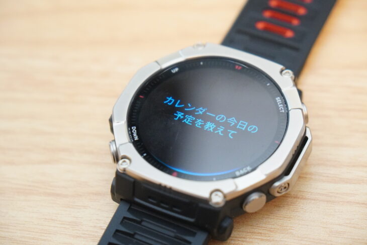天気を聞いたりタイマーをかけたりといった使い方のほか、カレンダーの予定を聞いたらカレンダーを表示してもらうこともできました。いわゆるネット検索のようなことはできないようですが、心拍数を確認したり、ワークアウトを開始したりと、ウォッチ内で認識できている指標や機能をサッと呼び出すのに便利です。