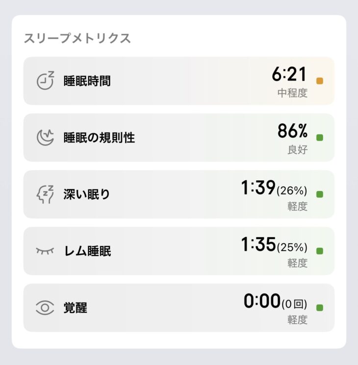 健康関連では、心拍数・血中酸素・ストレスレベルの24時間モニタリングに対応。睡眠についてはREMを含む睡眠段階、昼寝の時間、睡眠時の呼吸の質、睡眠スコアまで詳細に記録できます。睡眠計測の画面の見やすさや、計測される指標の充実度は、さすがスマートウォッチの大手ブランドという感じで非常にレベルが高いです。