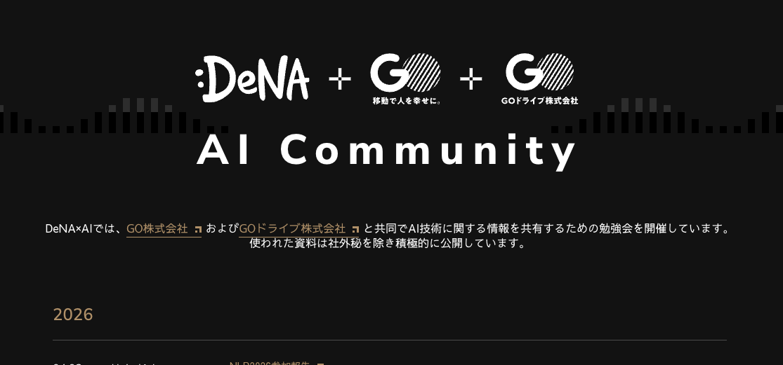 AIに関する最新の技術トピックを無料で学べる場所を探している方は多いのではないでしょうか。株式会社ディー・エヌ・エー(DeNA)が、GO株式会社・GOドライブ株式会社と共同で開催しているAI技術勉強会「DeNA×AI」の発表資料が、専用ページで一覧公開されています。2022年から2026年にかけての100本以上のスライドが時系列で並べられており、独学派にとって心強いアーカイブになっています。